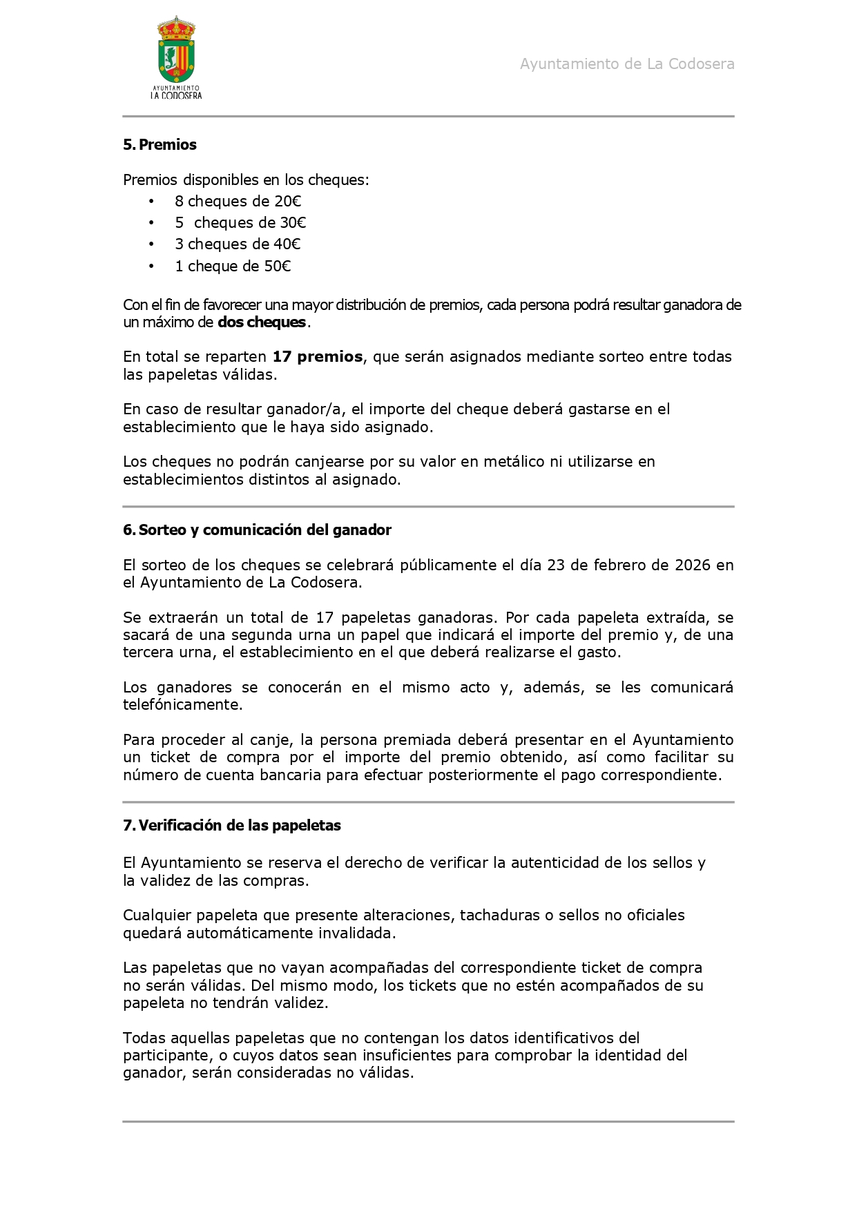 500€ en premios en vales de compra de 20€, 30€, 40€ y 50€. Por cada compra igual o superior a 20€ en los establecimientos participantes, recibirás una papeleta para el sorteo. Sorteo: lunes 23 de febrero, en directo por Facebook. Recoge tu papeleta sellada, grápala al ticket de compra y deposítala en la urna disponible en los eventos carnavaleros o en el Ayuntamiento La Codosera.¡Participa y gana comprando en el pueblo!