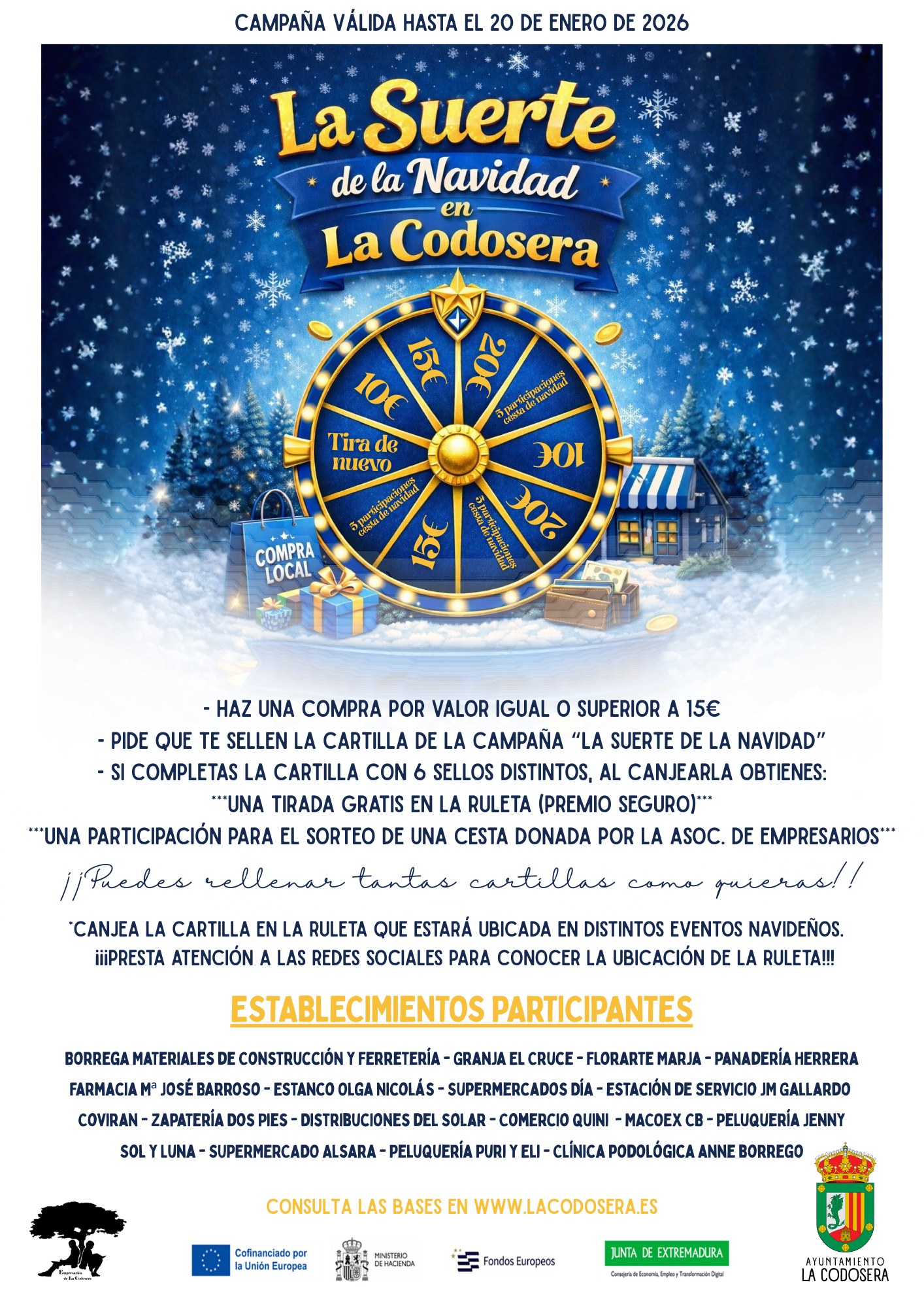 El Ayuntamiento de La Codosera organiza la campaña “La suerte de la navidad en La Codosera” en la que están en juego cheques por valor de 10, 15 y 20€ además de participaciones para el sorteo de la cesta de productos locales, aportada por La Asociación de Empresarios de La Codosera. En conjunto se pretende promocionar y dinamizar el comercio local, premiando la fidelidad de los clientes de los establecimientos adheridos.