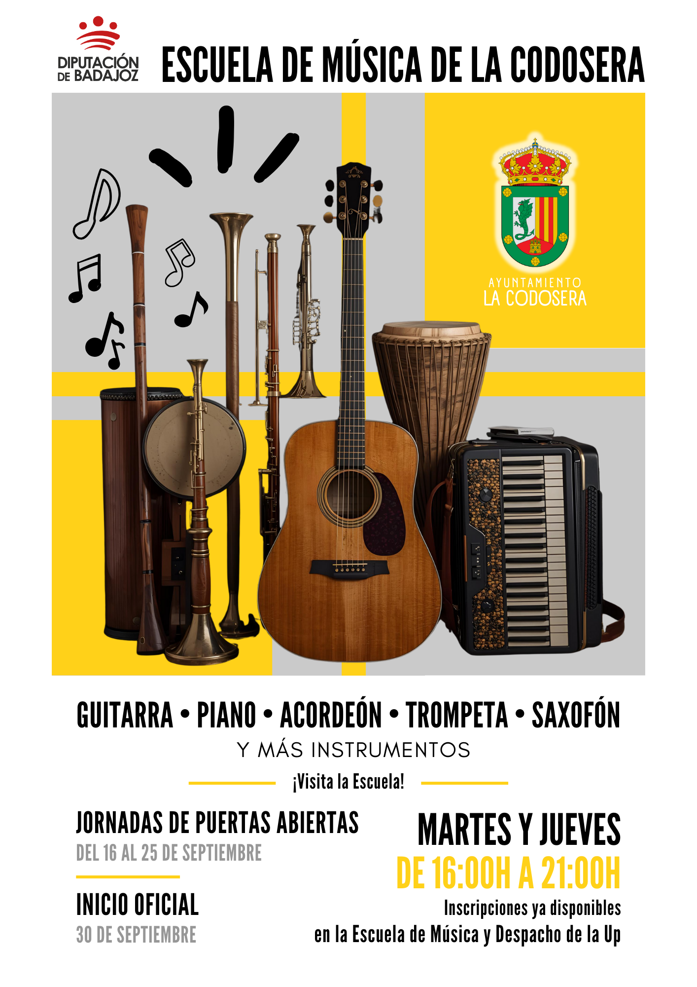 La música vuelve a sonar en La Codosera. Después del descanso veraniego, nuestra Escuela de Música abre de nuevo sus puertas. Si quieres aprender un instrumento, cantar o unirte a unos de los grupos existentes, ¡es el momento!