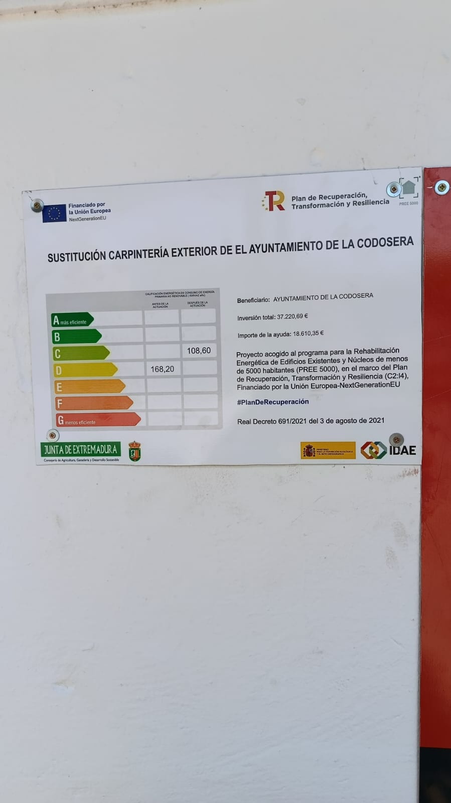 El Ayuntamiento de La Codosera ha sido beneficiario de una subvención en el marco de las bases reguladoras de ayudas para actuaciones de rehabilitación energética en edificios existentes, correspondientes al Programa de rehabilitación energética para edificios existentes en municipios de reto demográfico (Programa PREE 5000).